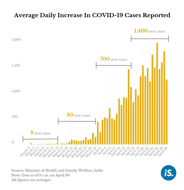 During the 21-day lockdown that began March 25, 2020, the rate of increase rose to 22% on March 31, 2020, and then halved to 11% by April 8, 2020.